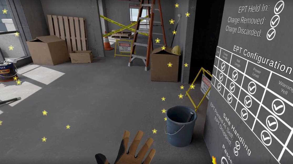 这包括选择合适的驱动器(钉子)、充电强度和 EPT 功率设置,以及操作 EPT 时所需的标志、禁区和声音警告。 指导部分完成后,玩家的知识将通过在没有指导的情况下完成相同的过程来测试。 玩家在评估过程中会自动获得实时反馈。