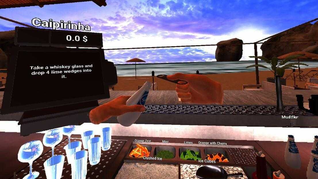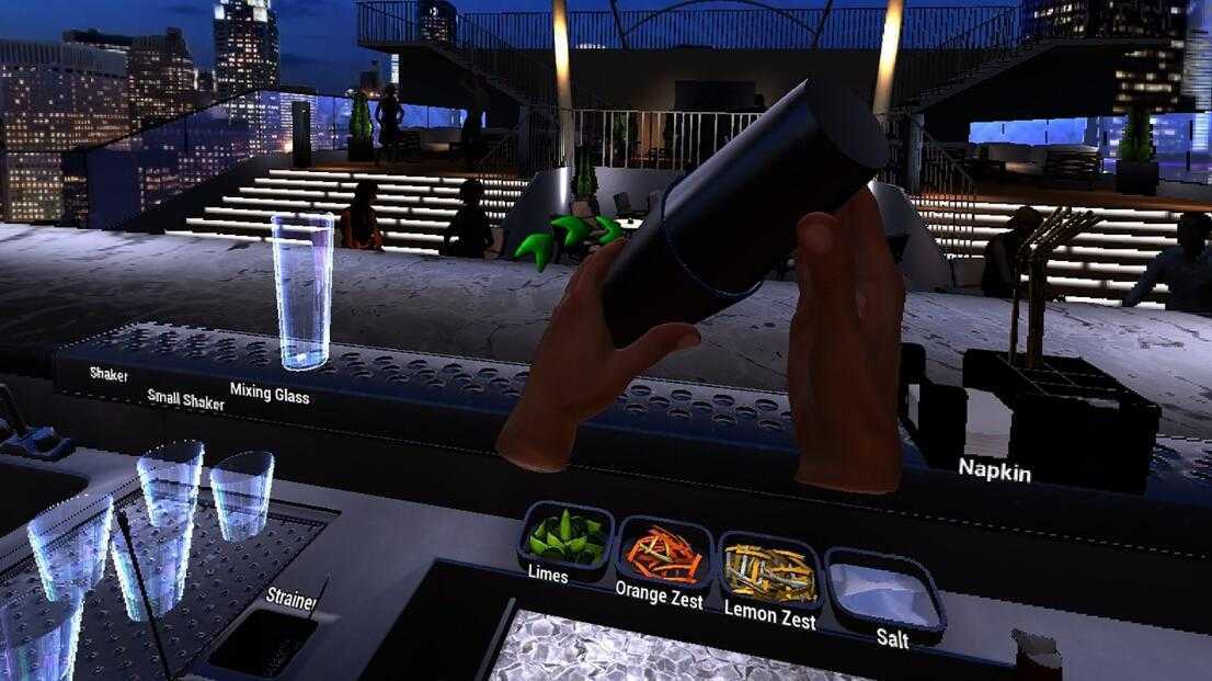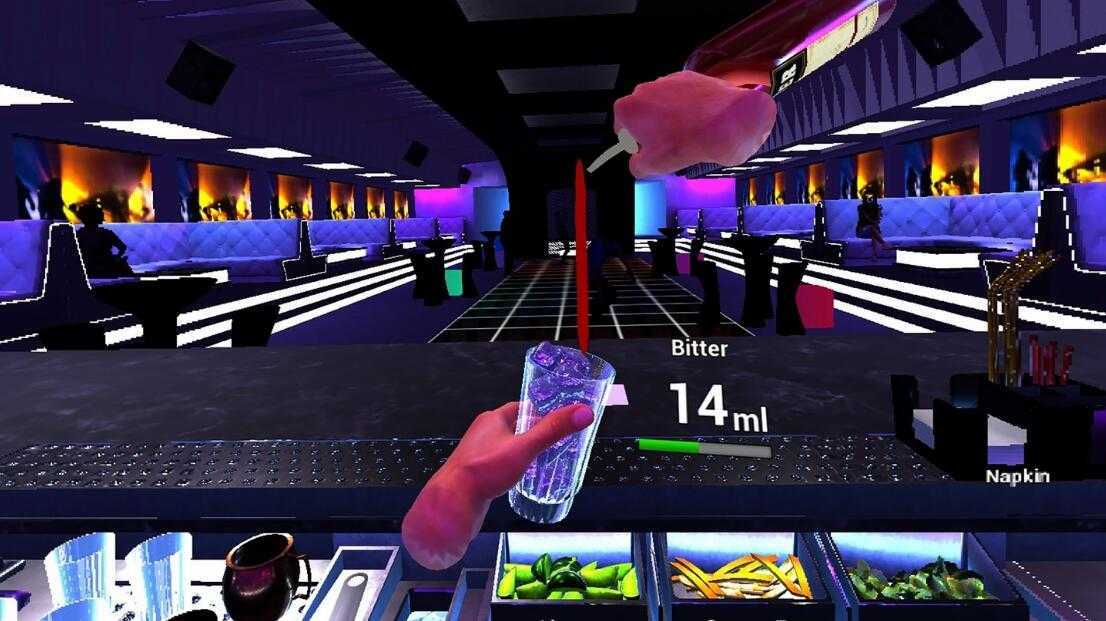 一系列酒杯可供选择,包括不同的酒、饮料和添加物。 碎冰还是冰块? 专业调酒知识。 各种调酒技巧。 现实生活中的液体物理和物品破坏。 调酒设备和饮料成分杂耍。 我们以超现实的品质为您服务。
